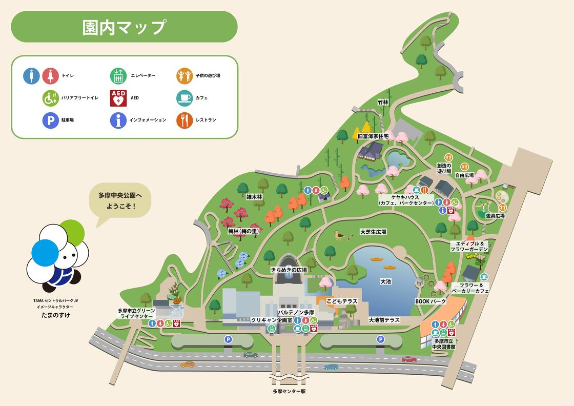 | 時間 | 【多摩中央公園】24時間開園 【パークセンター(インフォメーション)】9:00~17:00 【グリーンライブセンター】9:00~17:00 ※一時閉館中 ※2025 年4 月4 日までは電話のみ対応 火~金曜日(※ 9 時~17 時。祝日を除く) 【旧富澤家】※令和7年3月まで休館中 |