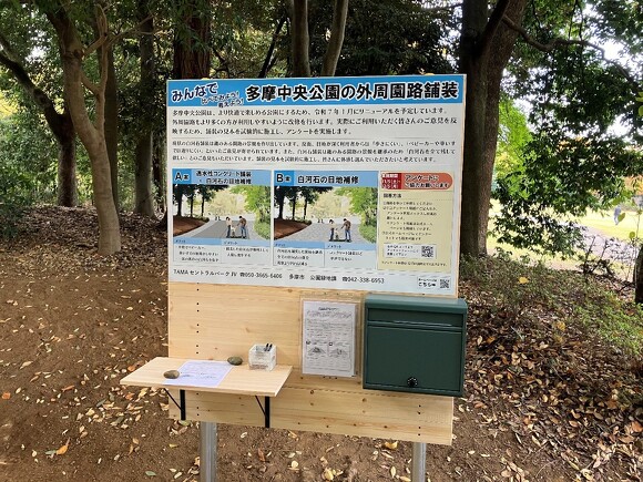 と銘打って多摩中央公園の外周園路舗装のアンケートの実施が始まりました。