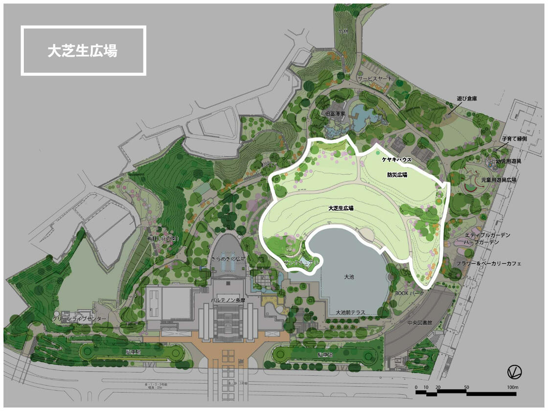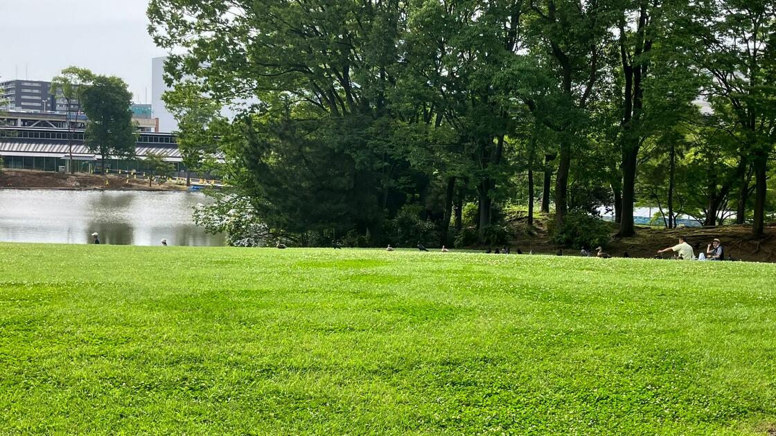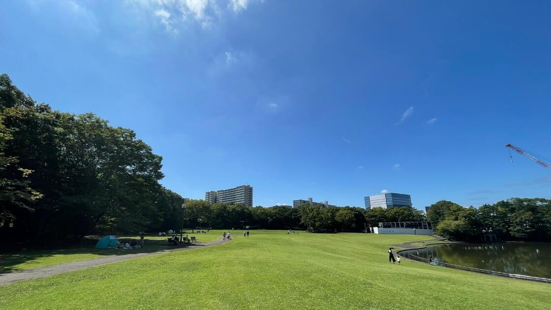 「大芝生広場」は、大池と囲むように芝生が広がっており