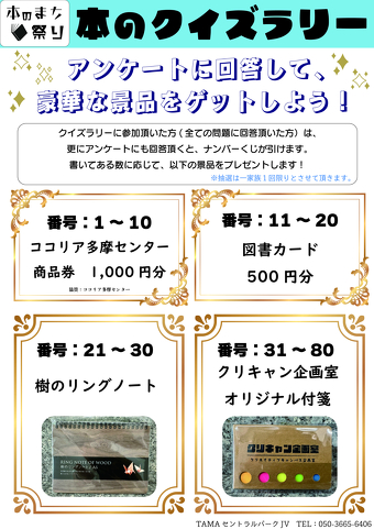 パルテノン多摩、多摩市立中央図書館、多摩中央公園、そして多摩センターエリアの書店にもご協力頂き、多摩センター駅から多摩中央公園までの道すがら、7つのポイントを巡る「本のクイズラリー」を開催します!