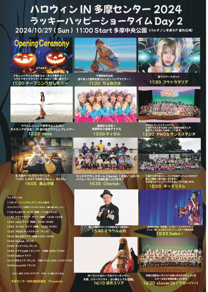 初めましてDaisysです。私達はニューシティ多摩センタービル8階で毎週木曜日 小学低学年、高学年、中学生クラスの3クラスに分かれて練習しています。 チアダンスの大会に出場したりチームの応援や、地域イベントに参加したり色々なシーンで活動しています。メンバーのほとんどが多摩センター在住なので 是非私達の活動を地元の皆さんに知ってもらいたいです。皆んなで多摩センターのハロウィンを盛り上げましょうどうぞ 宜しくお願いします!"
