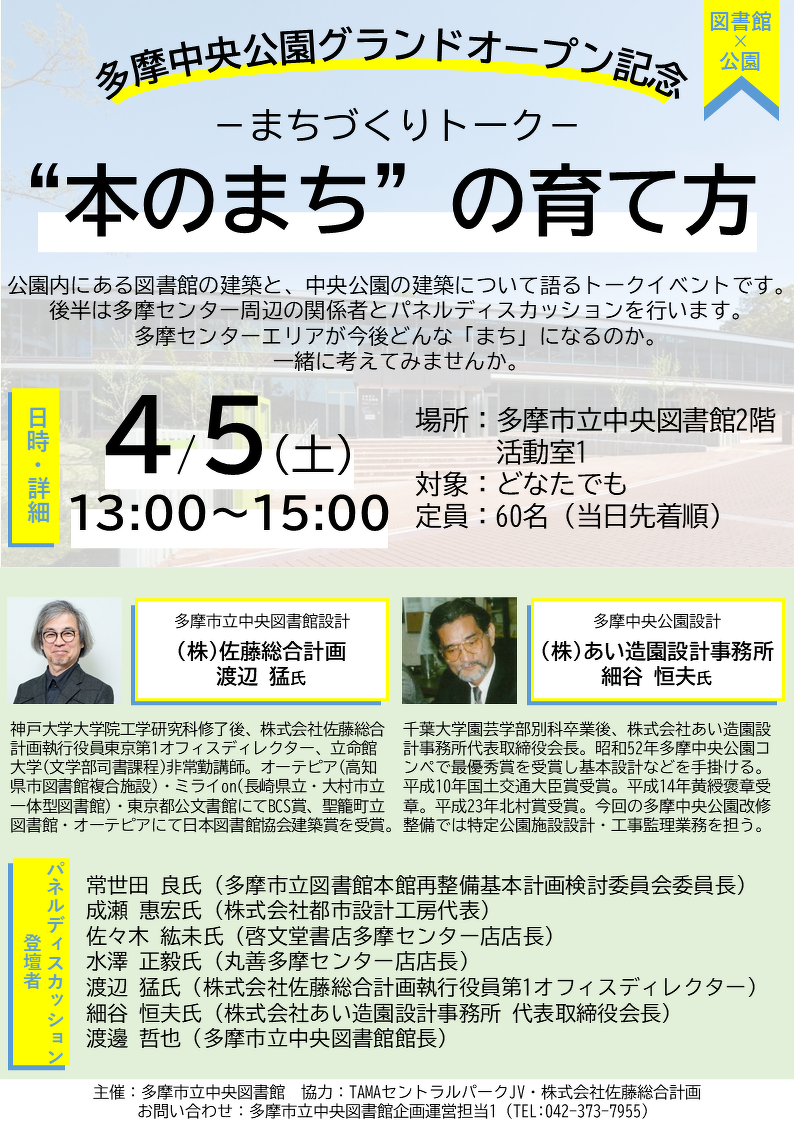 企画内容:公園内にある図書館の建築と、多摩中央公園の建築について語るトークイベントです。後半は多摩センター周辺の関係者とパネルディスカッションを行います。多摩センターエリアが今後どんな「まち」になるのか。一緒に考えてみませんか?