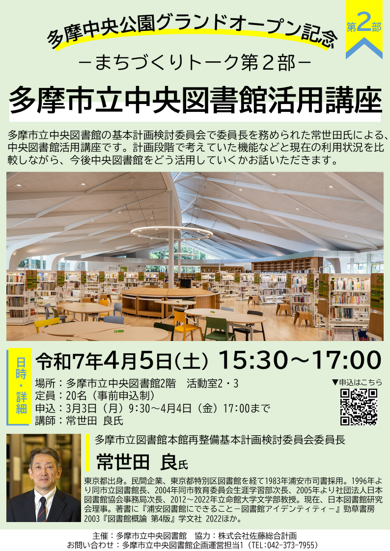 企画内容:多摩市立図書館本館再整備基本計画検討委員会委員長を務めた常世田氏による、図書館活用講座です。