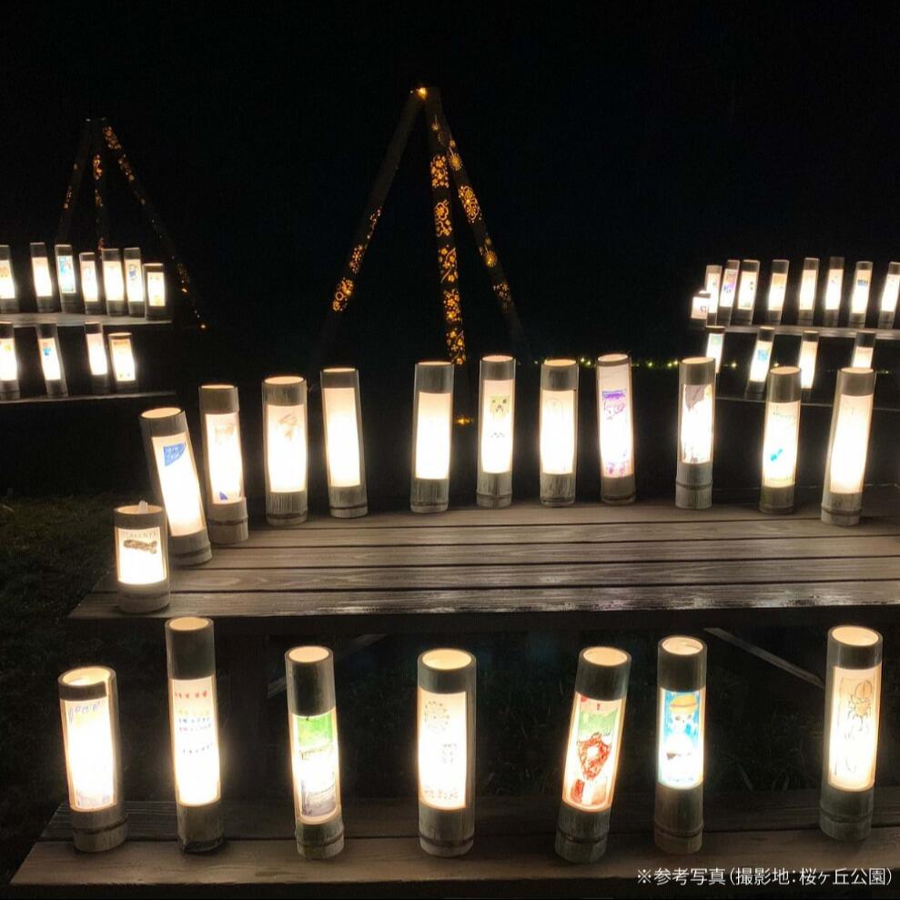 一本一本の竹に刻まれた絵が灯りとともに浮かび上がり、昼とは異なる幻想的な風景を生み出します。多摩の子どもたちが紡ぐ、温もりある光のアートをぜひご覧ください。